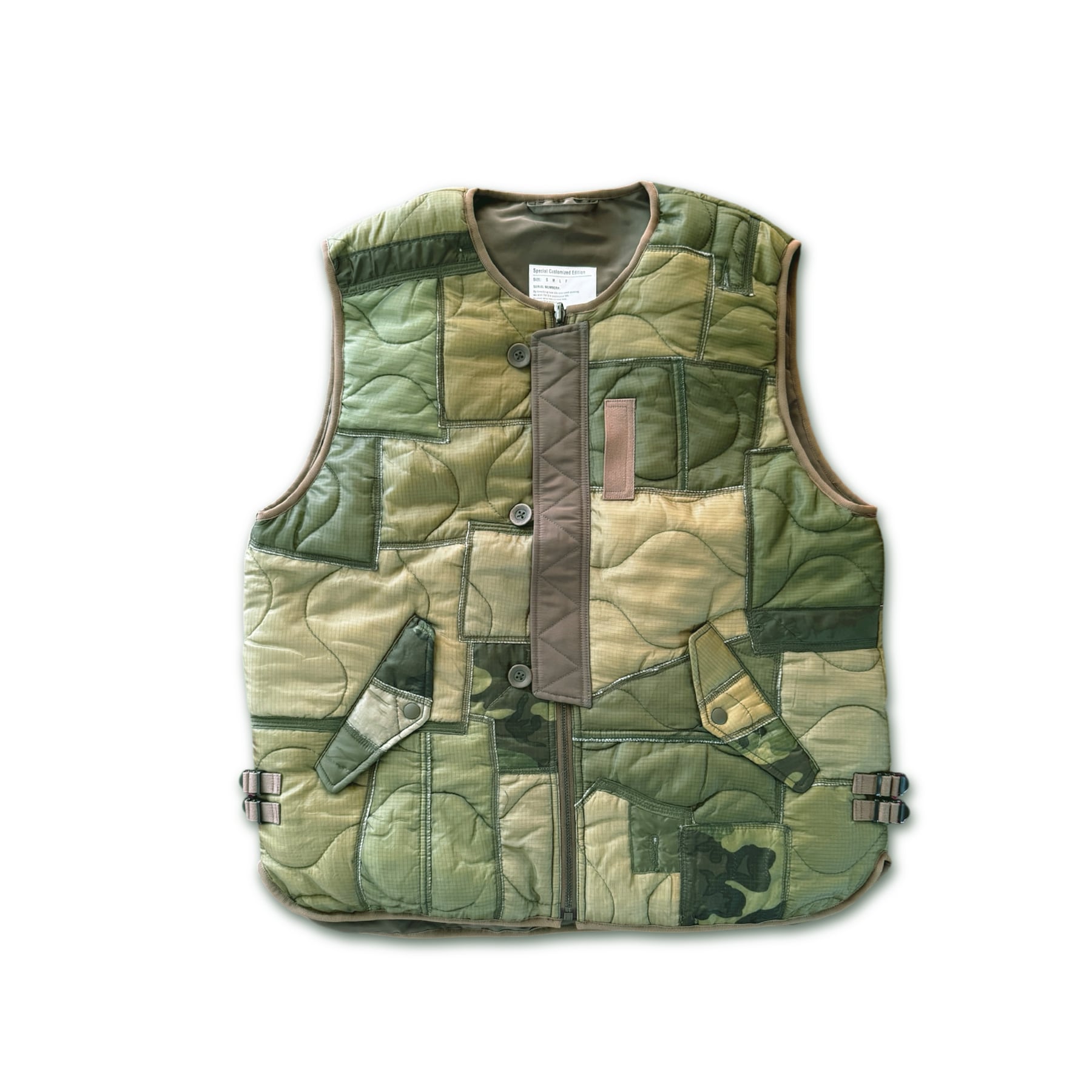 ミリタリーライナーを再構築し、パッチワークで仕上げた存在感あるキルティングベスト。