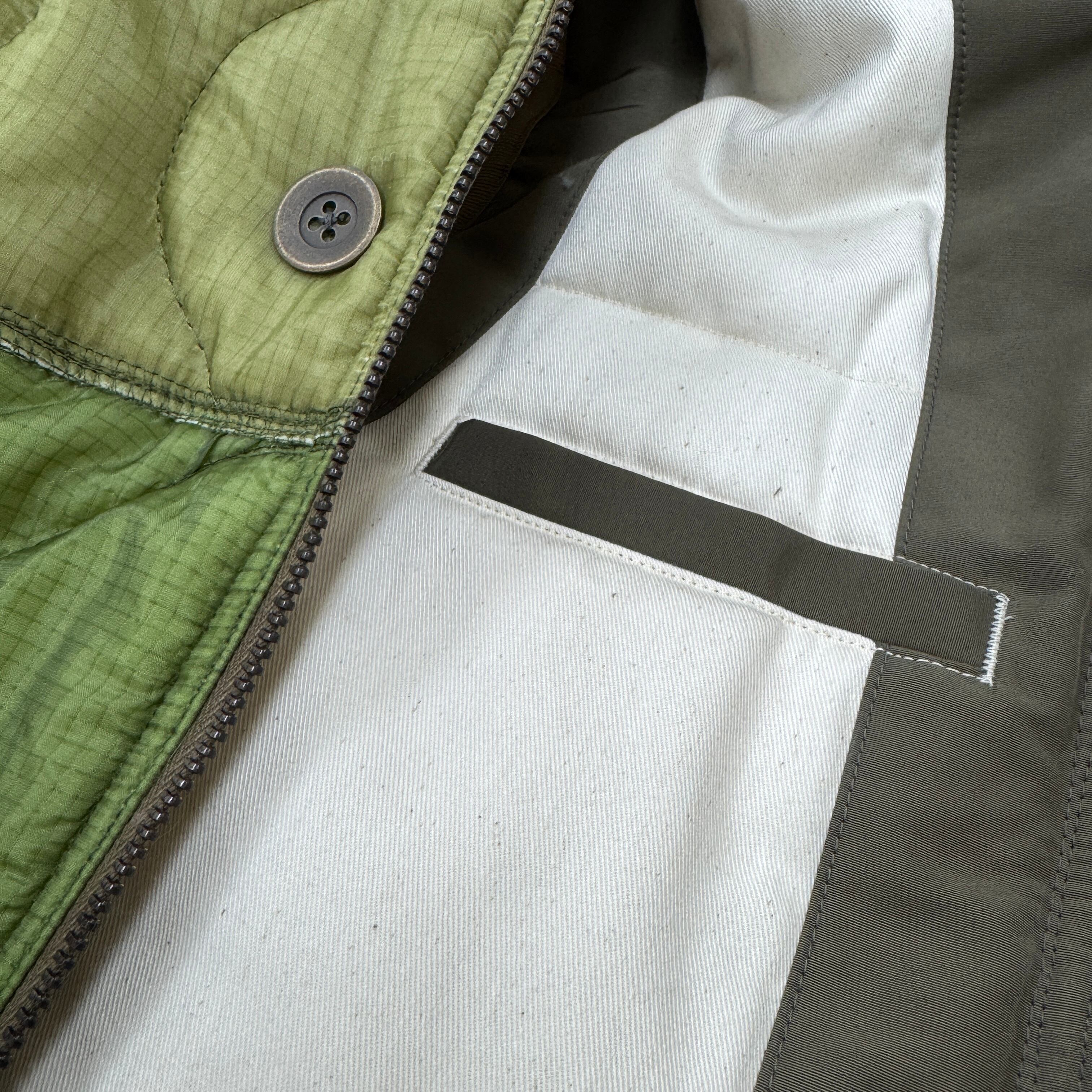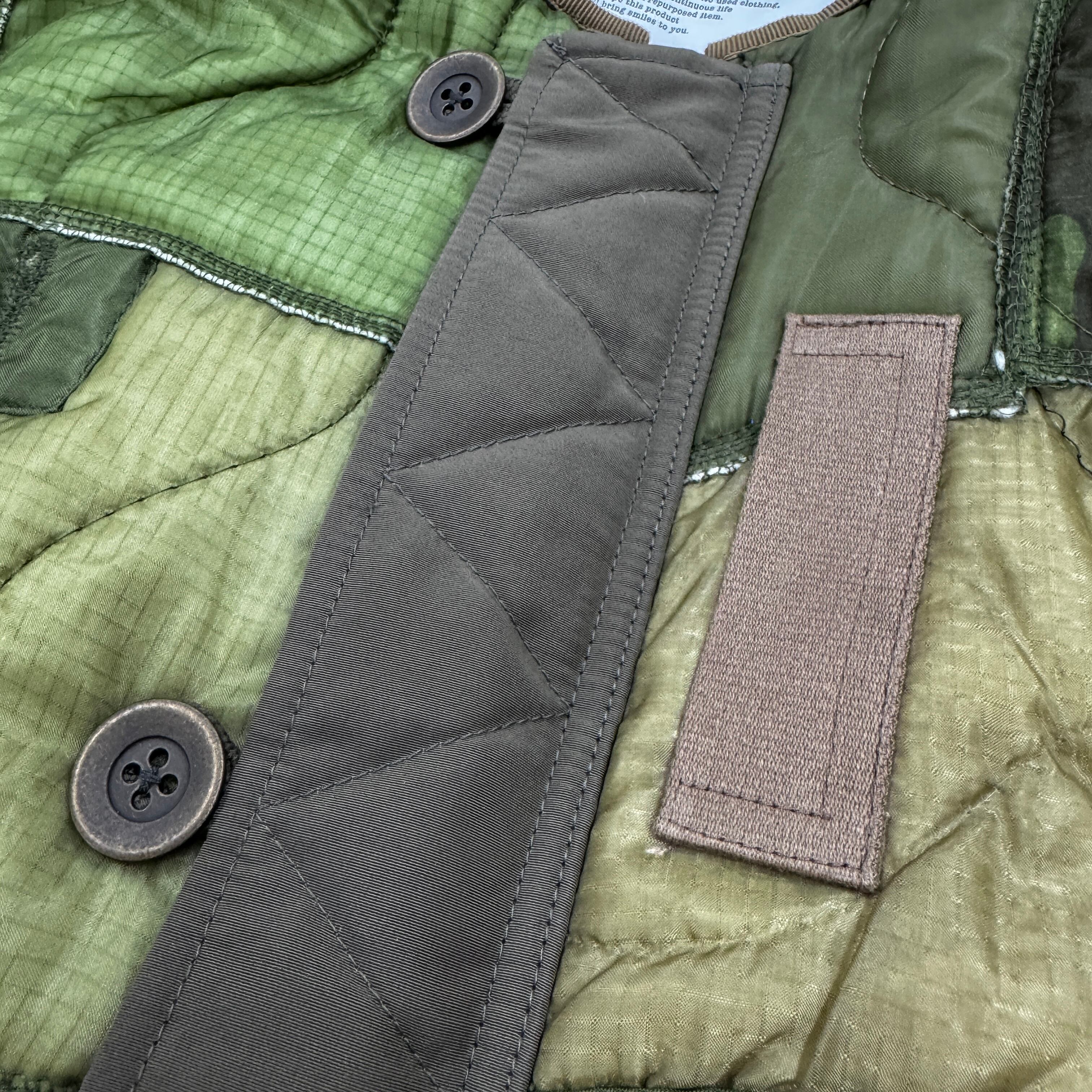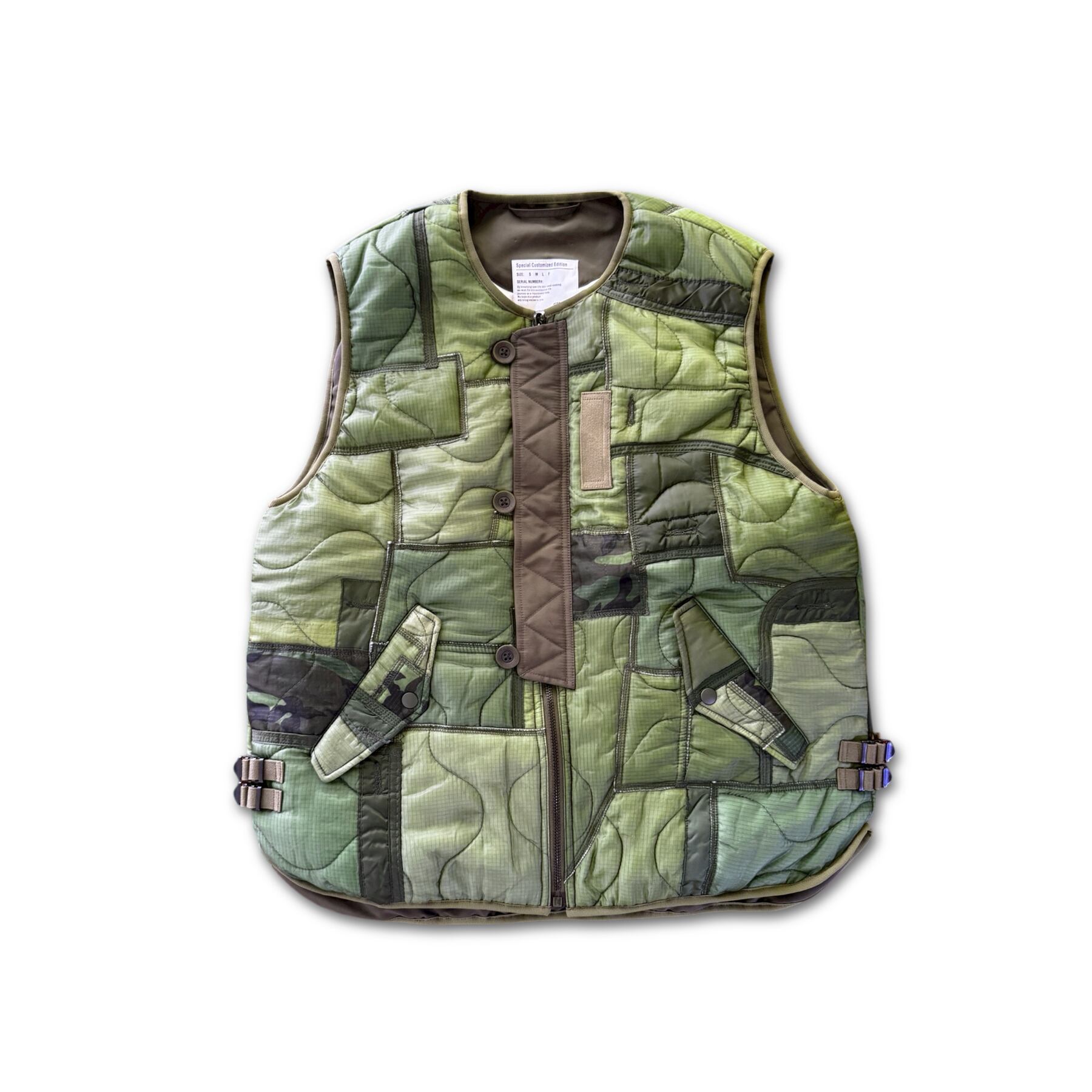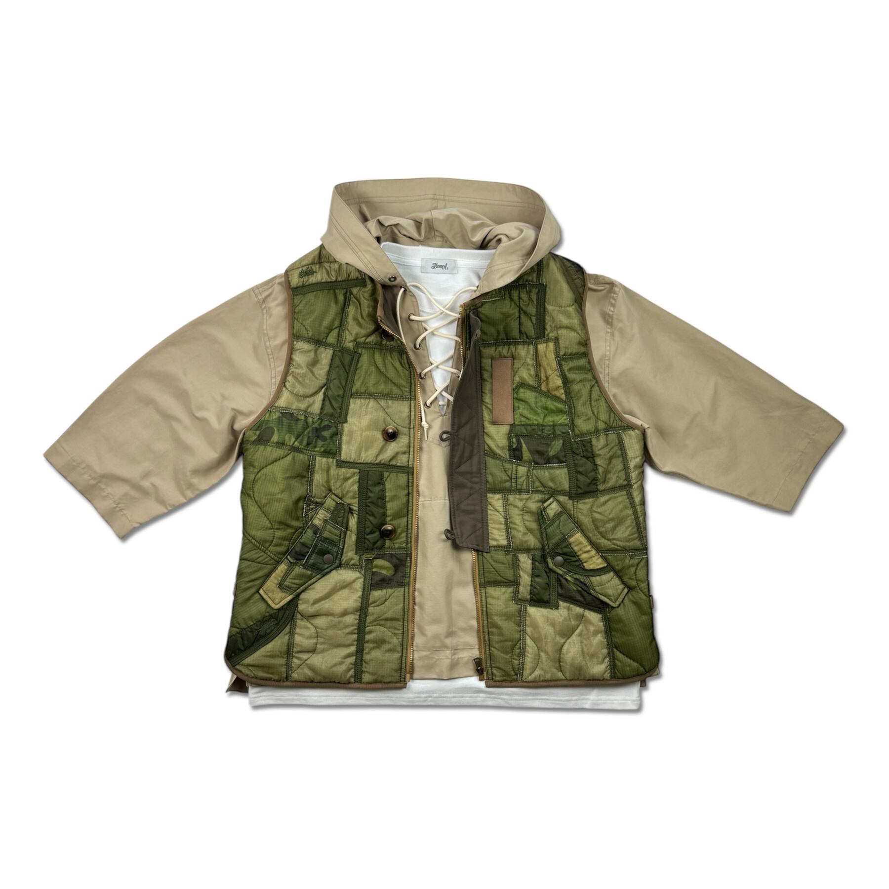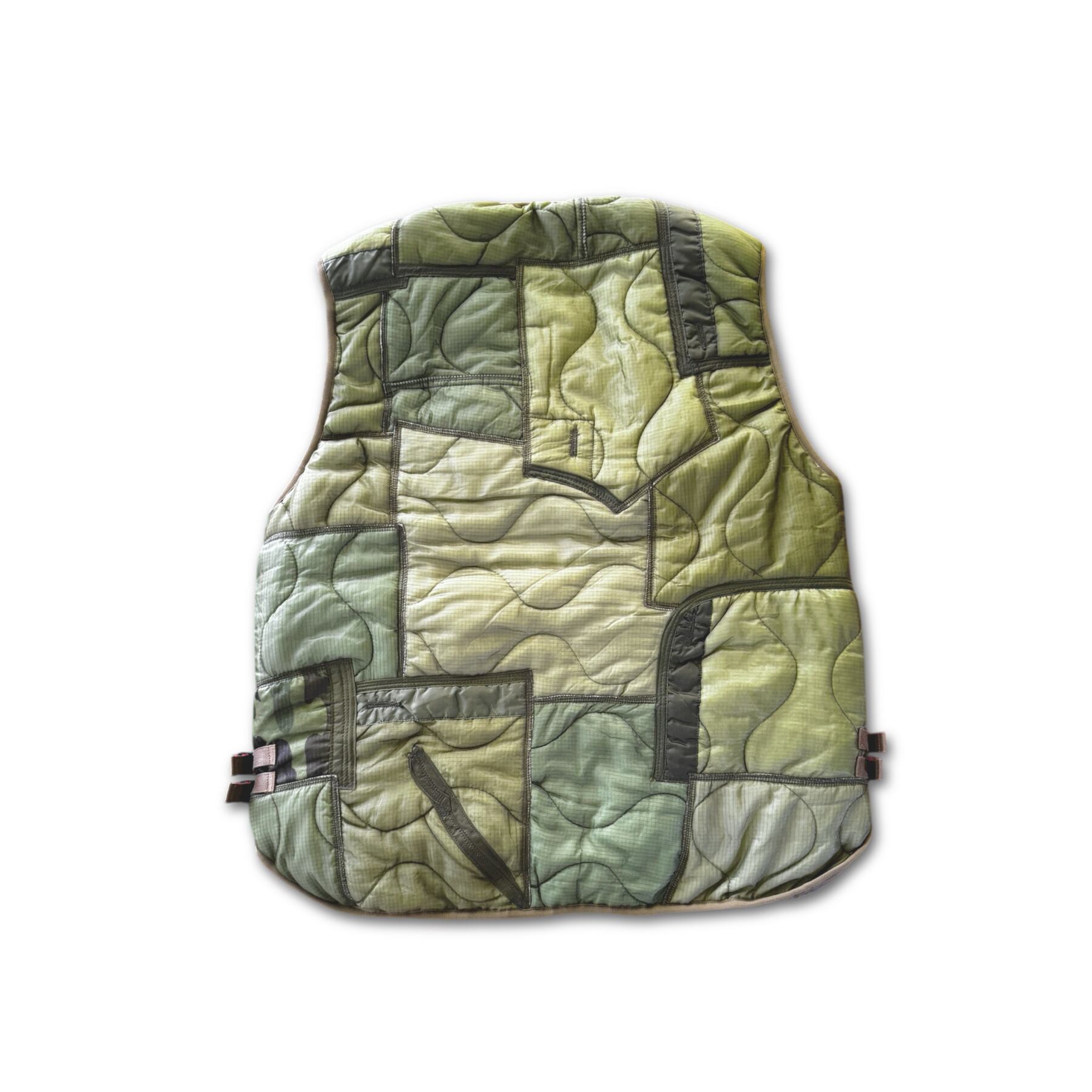 ミリタリーライナーを再構築し、パッチワークで仕上げた存在感あるキルティングベスト。