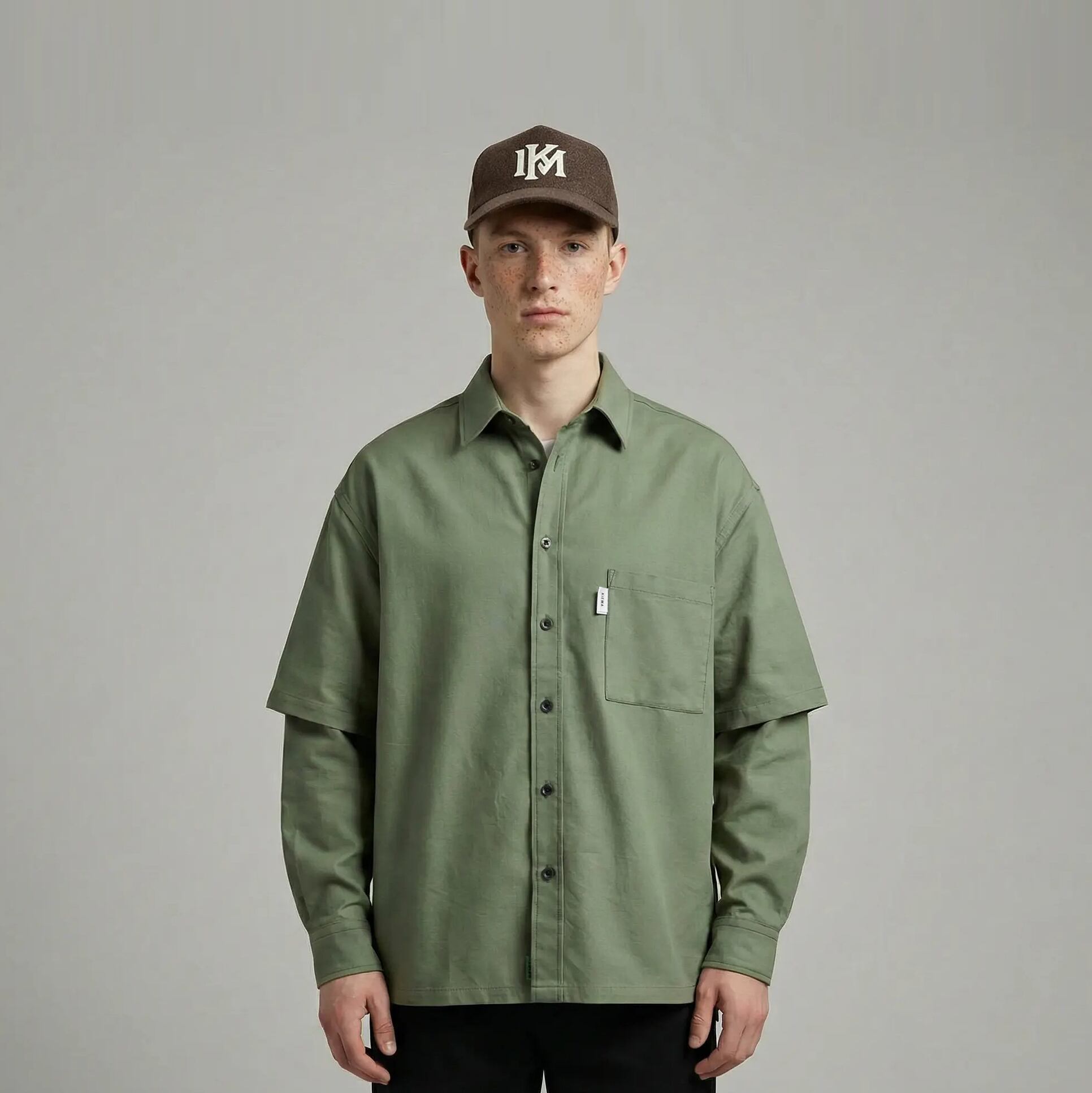 耐久性のあるリップストップ生地を使用した、モジュール構造のユーティリティシャツ。